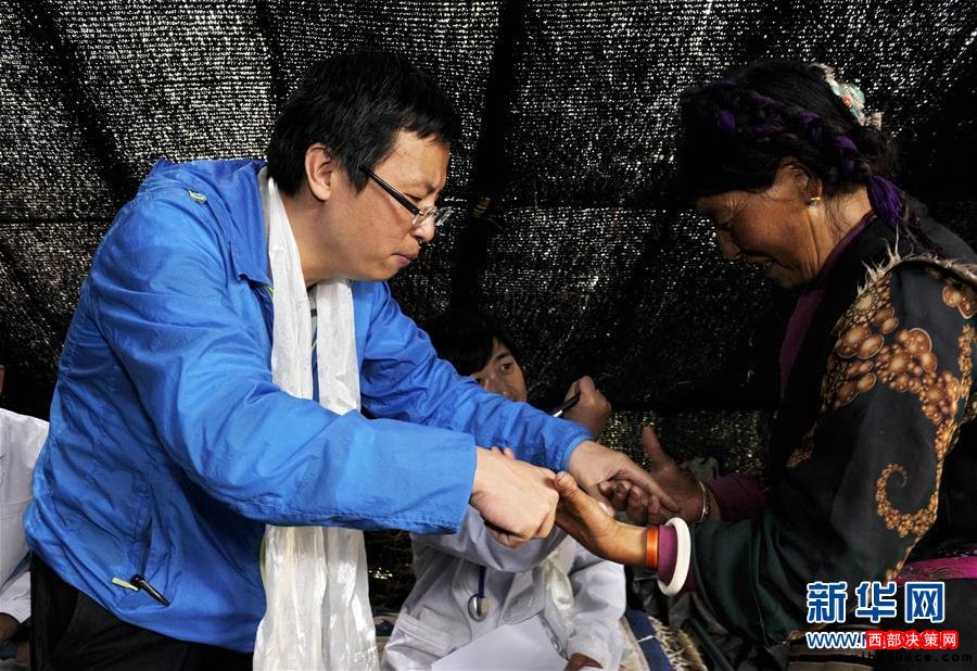 7月17日,北京大學(xué)人民醫(yī)院主治醫(yī)師劉田(左)在西藏人民醫(yī)院醫(yī)務(wù)處次仁達(dá)娃的翻譯下為巴爾卡村一名牧民查體。當(dāng)日,來(lái)自北京協(xié)和醫(yī)院、北京大學(xué)人民醫(yī)院、北京大學(xué)第三醫(yī)院等醫(yī)院的12名援藏醫(yī)療專(zhuān)家深入偏遠(yuǎn)的墨竹工卡縣門(mén)巴鄉(xiāng)巴爾卡村,為農(nóng)牧民義診。新華社記者 張汝鋒 攝
