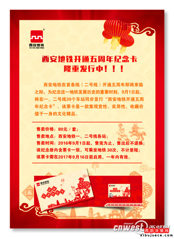 9月1日起,西安地鐵將在一、二號(hào)線39座車站同步發(fā)行“西安地鐵開(kāi)通5周年紀(jì)念卡”,售價(jià)80元。