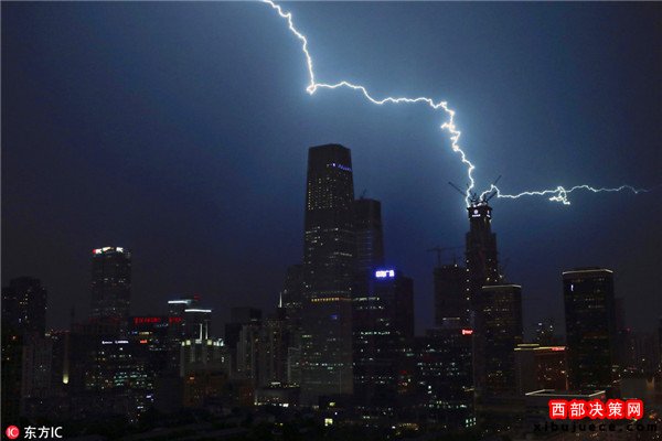 2016年9月7日,中國北京,夜幕降臨,一道道打雷閃電劃破京城夜空,觸目驚心。據(jù)北京市氣象局官方微博消息,北京市氣象臺(tái)7日17時(shí)45分發(fā)布雷電黃色預(yù)警信號(hào)。