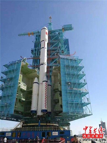圖為長征二號F T2運載火箭與天宮二號空間實驗室的垂直轉運。