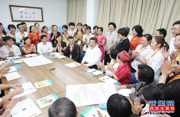 ?。?014年9月9日,習(xí)近平來到北京師范大學(xué)看望教師學(xué)生,向全國廣大教師和教育工作者致以崇高的節(jié)日敬禮和祝賀。這是習(xí)近平同正在北師大參加“中小學(xué)教師國家級培訓(xùn)計(jì)劃”的貴州小學(xué)骨干語文教師交流。新華社記者姚大偉攝)