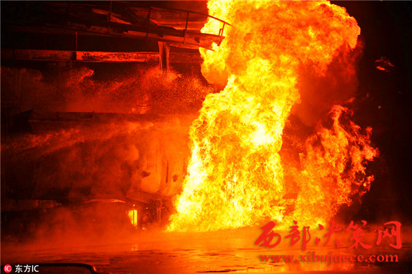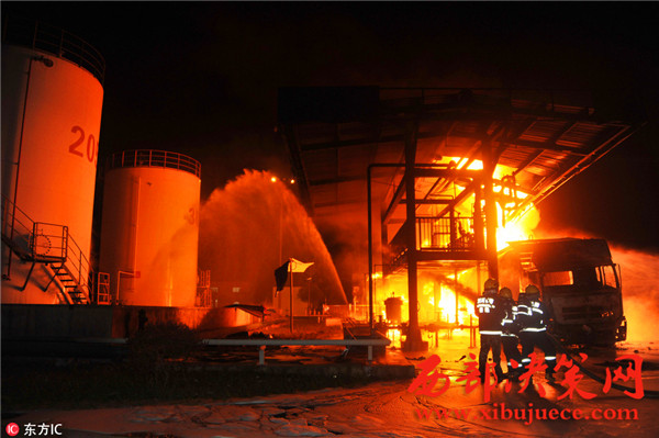 據(jù)了解,事故發(fā)生油罐區(qū)占地約40畝,主要生產(chǎn)航空汽油,油罐區(qū)共有油罐10個(gè),油罐內(nèi)裝有原料及航空汽油約300余噸,發(fā)油平臺(tái)往罐車內(nèi)輸送航空汽油時(shí)突然發(fā)生火災(zāi),燒毀發(fā)油平臺(tái)及油罐車等,著火油罐車儲(chǔ)量30噸,著火時(shí)車內(nèi)汽油約10噸,過濾器中有油約7噸,共計(jì)約17噸燃油,離鄰近儲(chǔ)油罐約30米。
