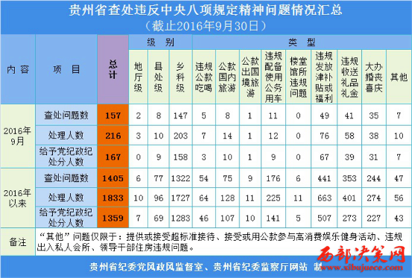 2016年1至9月,貴州省共查處違反中央八項規(guī)定精神問題1405起,處理1833人,給予黨紀政紀處分1359人。