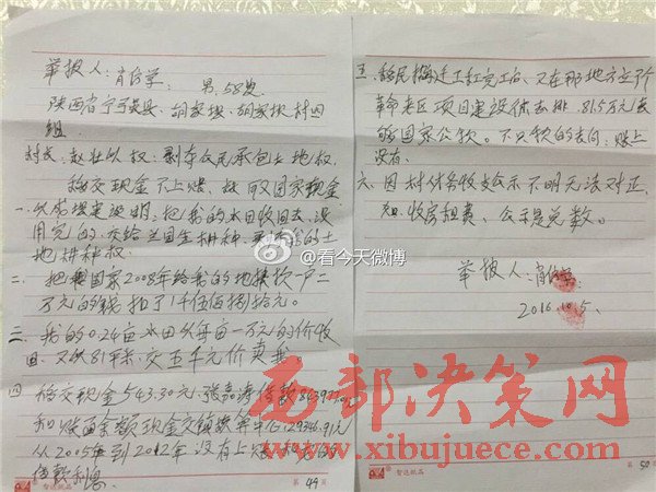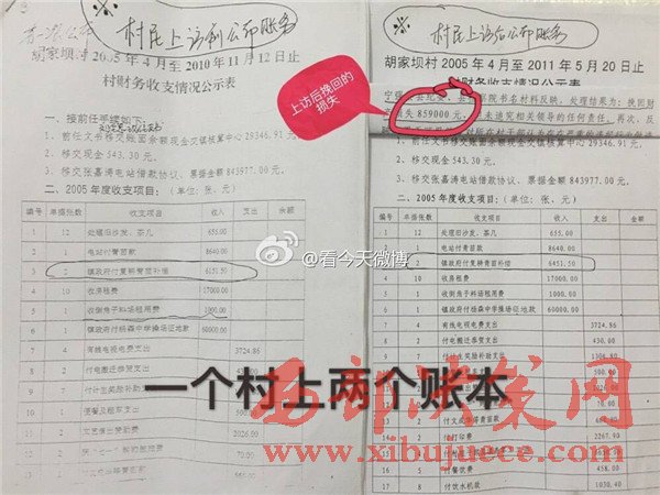 據(jù)實名舉報材料了解,早在2011年5月16日,經群眾上訪,寧強縣縣紀委、縣檢察院就對黨支部書記劉全忠作出過處理,挽回財產損失859000元,但并未追究其法律責任。從胡家壩村公布的賬目來看,村民上訪前和上訪后僅“鎮(zhèn)政府付復耕青苗補償”單這一款項就有300元的出入。一個村子竟然存在兩本財政收支賬目,到底哪本賬才是胡家壩村真正的財政收支賬目呢?為什么要做兩本性質相同的賬?會不會該村還有第三本賬?