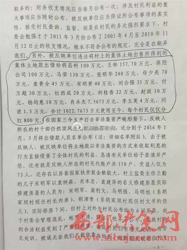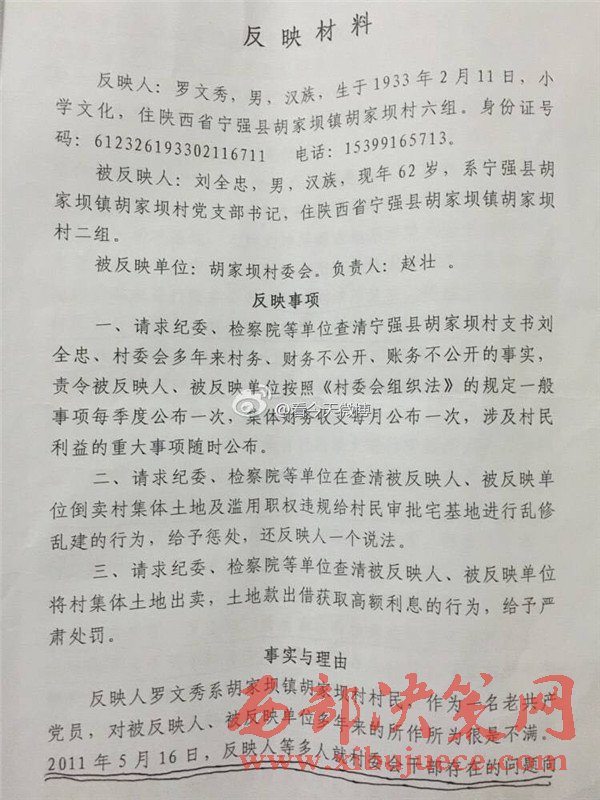 西部決策網訊 近日,有網友微博爆料,陜西省漢中市寧強縣胡家壩鎮(zhèn)胡家壩村,村干部劉全忠利用惠民政策,套取國家大量資金。對于國家扶貧項目,巧立名目、貪污、侵占村民利益。濫用職權違規(guī)審批宅基地,倒賣村集體土地,并將村上千萬余元出借他人賺取利息,且村務不公開、賬務弄虛作假、嚴重違紀行為。