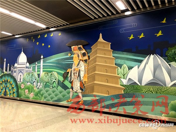 小寨地鐵站的文化墻上,除了有長(zhǎng)安的大雁塔、兵馬俑外,還有行走在絲路上的駱駝、以及絲路使者,既彰顯了長(zhǎng)安的歷史文化又體現(xiàn)了絲路元素。