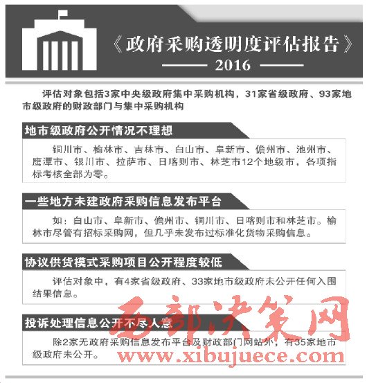 《報(bào)告》披露:我國政府采購信息公開情況仍不理想。主要表現(xiàn)為:地市級(jí)政府公開情況不佳。其中,陜西省銅川市、榆林市、吉林省吉林市、白山市、遼寧省阜新市、海南省儋州市、安徽省池州市、江西鷹潭市、寧夏銀川市以及西藏拉薩市、日喀則市和林芝市等12個(gè)地級(jí)市,在政府采購信息透明度各項(xiàng)指標(biāo)考核中全部為零分,在93家地市級(jí)政府成績(jī)排比中墊底。