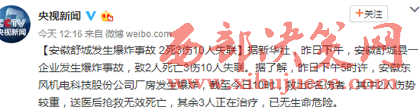 新聞中心官方微博今日消息稱,據(jù)新華社,昨日下午,安徽舒城縣一企業(yè)發(fā)生爆炸事故,致2人死亡3傷10人失聯(lián)。據(jù)了解,昨日下午5時許,安徽東風(fēng)機(jī)電科技股份公司廠房發(fā)生爆炸,截至今日10時,救出5名傷者,其中2人傷勢較重,送醫(yī)后搶救無效死亡,其余3人正在治療,已無生命危險。