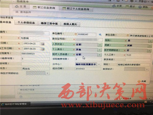 為了進(jìn)一步了解到底是陜西省交通集團(tuán)榆靖分公司紀(jì)委部造假還是陜蒙界收費(fèi)站職工(提供的考勤表上有明顯涂改痕跡,天數(shù)是28天)和站長(zhǎng)自己(自敘錄音)一起造假。在合療辦調(diào)取查看的合療系統(tǒng)顯示,單位編號(hào)01000347,名稱(chēng)陜交建高速榆靖分公司,劉某工資7123元。