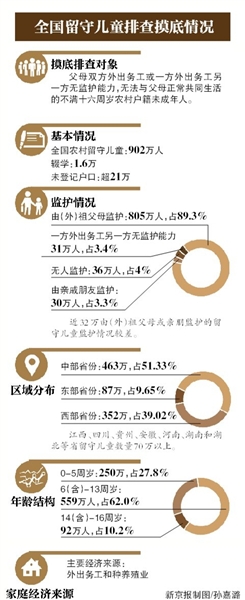 在昨日召開的農(nóng)村留守兒童關愛保護工作部際聯(lián)席會議上,民政部副部長高曉兵透露了此次摸底排查的結(jié)果。據(jù)她介紹,此次摸底排查開始于今年3月底,排查結(jié)果顯示,全國農(nóng)村留守兒童902萬人。
