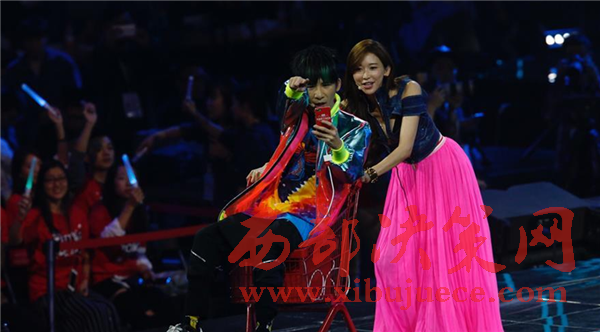 藝人大張偉(左)與林志玲在晚會(huì)上與觀眾互動(dòng)