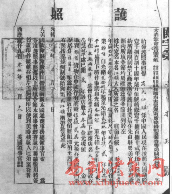 1905年8月18日,廣東花縣人江驥的護照,由時任兩廣總督岑春煊簽發(fā),并有美國廣州總領(lǐng)事雷伏禮的簽證