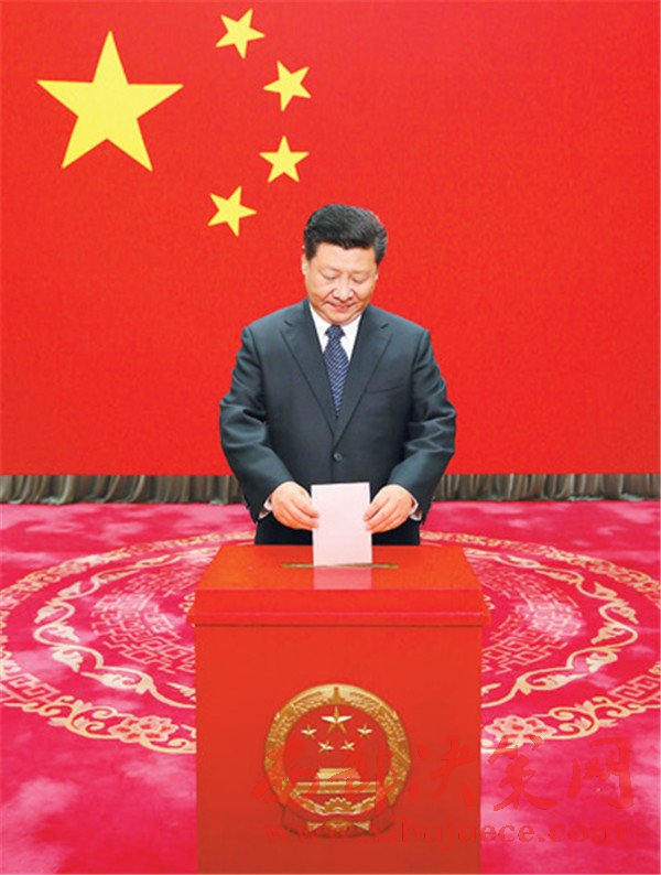上午10時(shí)許,習(xí)近平來到懷仁堂投票站,同投票站的工作人員親切握手,仔細(xì)聽取有關(guān)選舉事項(xiàng)的說明。習(xí)近平拿出選民證交給工作人員核驗(yàn),并領(lǐng)取了一張選票。在寫票處認(rèn)真填寫選票后,習(xí)近平走到票箱前鄭重投下自己的一票。