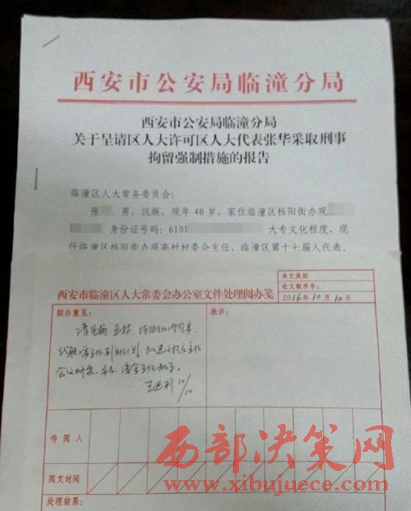 相關(guān)人士向澎湃新聞提供的一份西安市公安局臨潼分局關(guān)于“呈請區(qū)人大許可區(qū)人大代表張華采取刑事拘留強(qiáng)制措施”的報告顯示,張華,男,家住臨潼區(qū)櫟陽街辦觀高村第六組,現(xiàn)任臨潼區(qū)櫟陽街辦觀高村村委會主任,臨潼區(qū)第十七屆人大代表。上面還附有西安臨潼區(qū)人大常委會辦公室文件處理閱辦箋的擬辦意見:“需研究決定”。