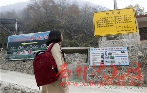 昨日上午,華商報(bào)記者來到王莽街道小峪河村涉事農(nóng)家樂,該農(nóng)家樂仍在正常營(yíng)業(yè)。在農(nóng)家樂門口,立著一個(gè)很顯眼的黃色警示牌,是長(zhǎng)安區(qū)防汛抗旱指揮部辦公室設(shè)置的,上面寫著2015年8月3日突發(fā)山洪造成九人死亡的事情,并提醒群眾遠(yuǎn)離河道,雨天不得在溝口逗留,不得在此亂搭亂建,該牌子。在警示牌下面,有一條用水泥砌成的水溝,從路邊一直通往山上,華商報(bào)記者注意到,在山坡上有水向下流出。