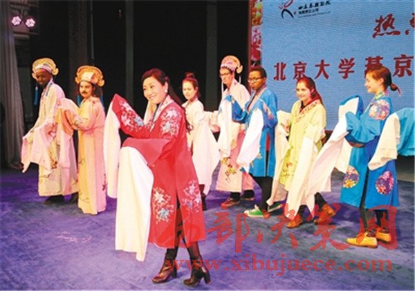 臺(tái)下就座的,則是一群特殊的學(xué)生——北京大學(xué)燕京學(xué)堂的來(lái)自42個(gè)國(guó)家和地區(qū)的學(xué)生們,他們把易俗社小劇場(chǎng)坐得滿滿當(dāng)當(dāng)。在英語(yǔ)翻譯的配合下,秦腔這種中國(guó)非物質(zhì)文化遺產(chǎn)的精髓被一點(diǎn)點(diǎn)輸入他們的腦海。