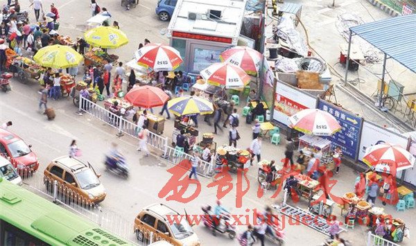 (沒(méi)有整治前。進(jìn)入火車(chē)站前的道路上,商販的推車(chē)構(gòu)成兩條直直的長(zhǎng)線(xiàn)。資料圖)
