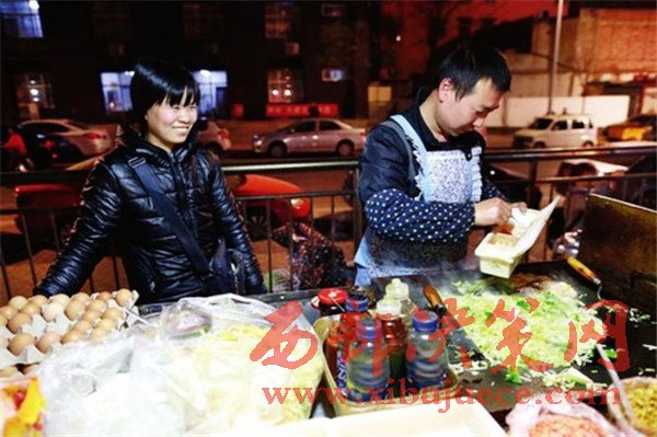 同樣是炒面,河南的楊氏夫婦賣的則是“鐵板炒”,在這個(gè)夜市攤干了近4年,每天倆人同出同進(jìn),朝夕相處,“有老婆在身邊,干活兒更有動(dòng)力,做生意也更和諧,更溫情。”