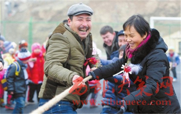 圖為11日,在大浦溝社區(qū)民族團結(jié)廣場,居民們正在進行拔河比賽。