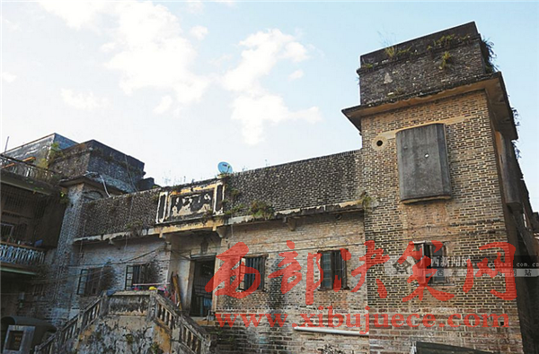 在教育路第一小學對面一座大院里,果然立著一棟形如圍屋的方形磚樓,氣派的門樓,圍墻四角高聳的碉樓,均顯示著主人當年顯赫的身世。