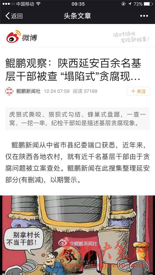 據(jù)微博 鯤鵬新聞社爆料 從中省市縣紀(jì)委端口獲悉,近年來,僅在陜西各地農(nóng)村,就有近千名基層干部由于貪腐問題被立案查處。鯤鵬新聞在此搜集整理延安部分(有刪減),以期警示。