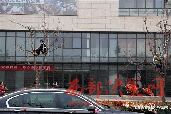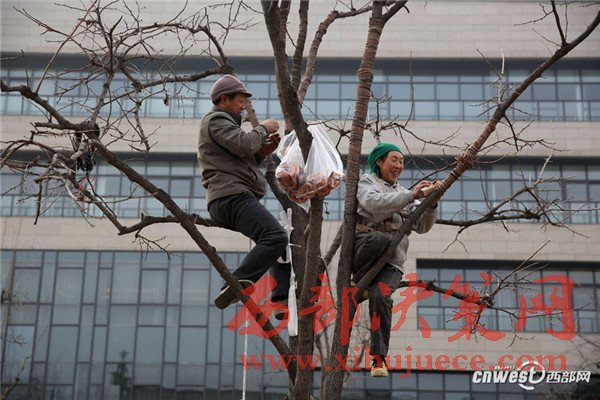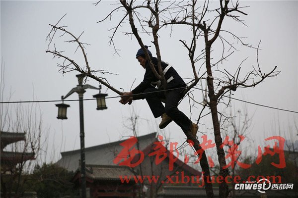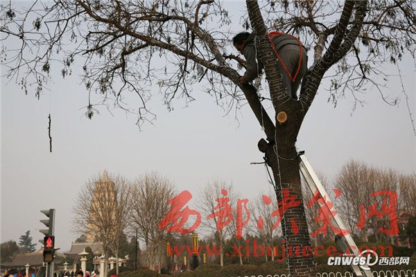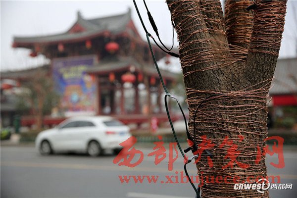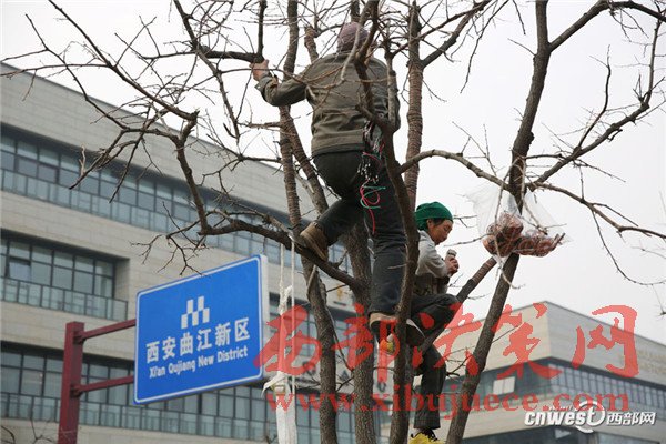 12月24日,西安市曲江新區(qū)芙蓉南路、雁塔南路,不少工人爬到樹上綁彩燈。一名正在樹上往樹枝上一圈一圈纏繞彩燈的師傅說(shuō):“綁一棵樹的彩燈一人得花半天到一天時(shí)間。”