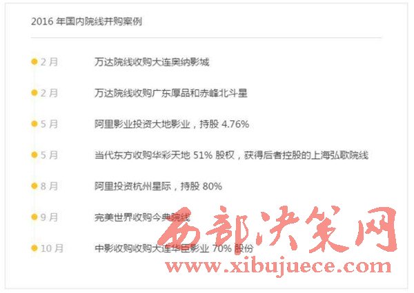 6年前,萬達院線伴隨著萬達商業(yè)地產(chǎn)的擴張不斷擴充自有院線。但隨著萬達的輕資產(chǎn)轉(zhuǎn)型和地域擴張的基本飽和,從去年始,萬達開始嘗試以并購的方式來擴大院線規(guī)模。2016年2月,萬達院線發(fā)布公告,宣布收購大連奧納,并將6家奧納影城一并納入麾下,同時收購了廣東厚品、赤峰北斗星兩家影投公司。8月24日,萬達院線與韓國CJ集團達成戰(zhàn)略合作,CGV影院將加盟萬達院線,同時雙方就映前廣告代理、4DX影院建設(shè)等事項開展合作。