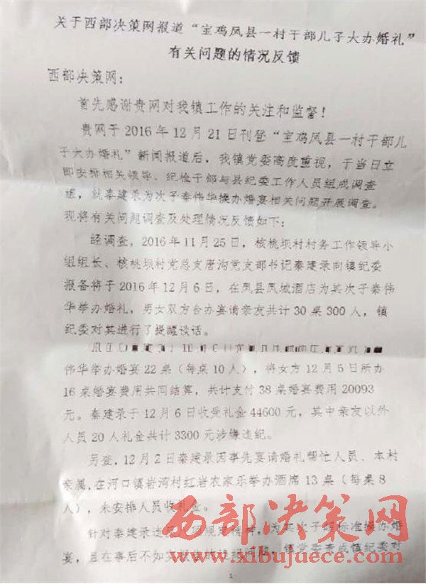 西部決策網(wǎng)訊(任書(shū)彥) 本網(wǎng)2016年12月21日刊文《寶雞鳳縣一村干部?jī)鹤哟筠k婚禮》報(bào)道鳳縣河口鎮(zhèn)唐溝村支部書(shū)記秦建錄直接挑戰(zhàn)中央八項(xiàng)規(guī)定,為兒子大辦婚禮。經(jīng)寶雞市紀(jì)委批示鳳縣紀(jì)委從嚴(yán)查處。