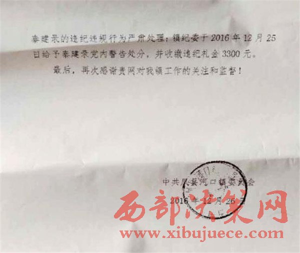 2016年12月27日鳳縣河口鎮(zhèn)人民政府回饋:經(jīng)鳳縣河口鎮(zhèn)紀(jì)委查處,對(duì)涉事人鳳縣河口鎮(zhèn)唐溝村支部書(shū)記秦建錄黨內(nèi)警告處分,并收繳違紀(jì)禮金3300元。