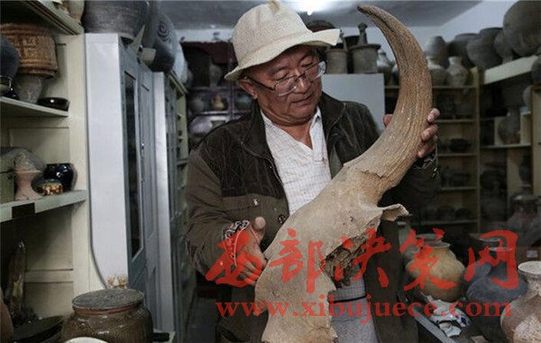 2016年9月23日,陜西榆林,原始牛牛角化石有40多斤重,劉福學(xué)猜測,20萬年前的原始牛有現(xiàn)在的牛20頭大,起碼有10噸。