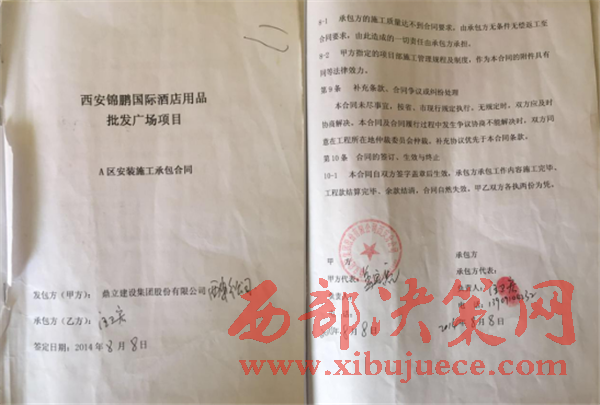 西部決策網(wǎng)訊(王博 通訊員 王德)近期,我社不斷接到汪衛(wèi)宏來電、來信稱;2014年4月底,鼎立建設(shè)集團(tuán)股份有限公司西安分公司找到我;讓我?guī)Чと嗽?lsquo;西安錦鵬國(guó)際酒店用品批發(fā)廣場(chǎng)項(xiàng)目’干水、電安裝,至今拖欠民工一百多萬工資款;發(fā)包方和業(yè)主雙方相互推諉。