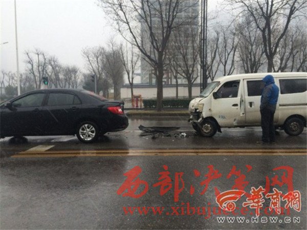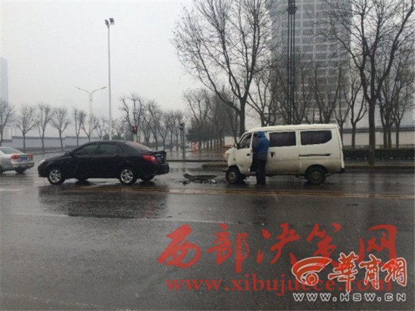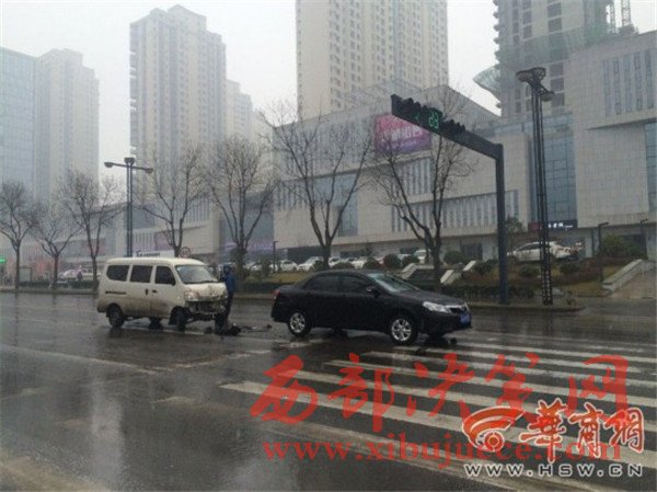 原標(biāo)題:西安雪天路面濕滑面包車遇紅燈剎車不及撞上私家車