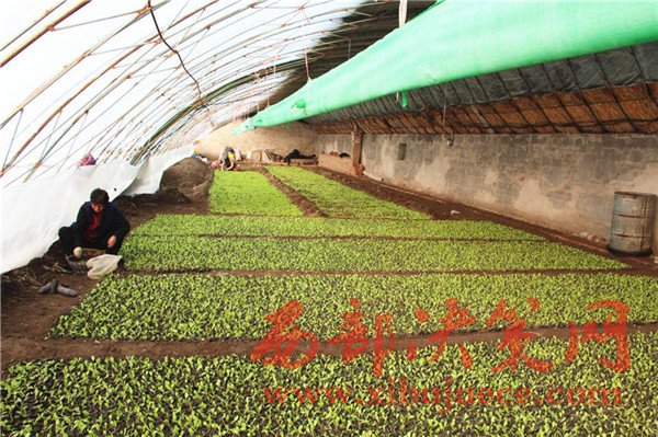 在王磊家的大棚內(nèi),滿眼的綠色郁郁蔥蔥,棚內(nèi)大約培育了十萬余株蔬菜幼苗,有萵筍、蓮花白,棚里光線充足,空氣濕潤,室內(nèi)溫度高達(dá)零上26攝氏度,為菜苗提供了良好的生長條件。隨處可見農(nóng)民忙碌的身影,有的在移苗,有的在為營養(yǎng)袋裝土,有的在裝穴盤,動作嫻熟、井井有條。