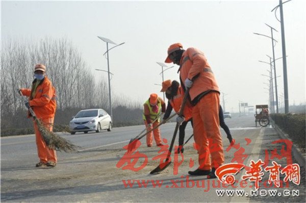 2月12日下午,在周至南大街,66歲的保潔員姜益梅在路面工作。