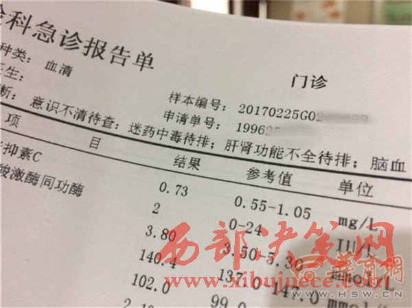 小美的檢查報告顯示,醫(yī)院方面臨床診斷為,意識不清待查、迷藥中毒待排、肝腎功能不全待排等。