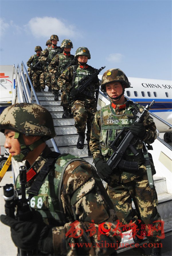 參加反恐維穩(wěn)誓師大會的武警官兵到達(dá)喀什機(jī)場,向任務(wù)區(qū)進(jìn)發(fā)。