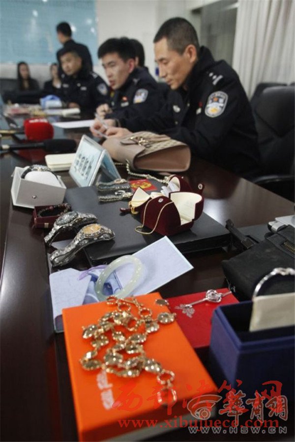 2017年3月2日,西安市公安局高新分局刑偵大隊,民警正在介紹案情,追回的贓物放滿了桌子。