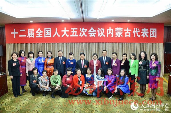 內(nèi)蒙古代表團(tuán)的代表們與現(xiàn)場女記者合影留念。