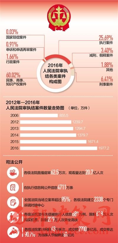 2016年,各級(jí)法院向執(zhí)行難全面宣戰(zhàn),共受理執(zhí)行案件614.9萬(wàn)件,執(zhí)結(jié)507.9萬(wàn)件,同比分別上升31.6%和33.1%,執(zhí)行到位金額1.5萬(wàn)億元,同比上升54%。與公安部等10多個(gè)部門(mén)建立網(wǎng)絡(luò)執(zhí)行查控系統(tǒng),執(zhí)行法官足不出戶即可依法查詢被執(zhí)行人財(cái)產(chǎn)和相關(guān)信息,實(shí)現(xiàn)了執(zhí)行模式的根本變革。發(fā)布失信被執(zhí)行人信息689萬(wàn)例,限制628萬(wàn)人次購(gòu)買(mǎi)機(jī)票,限制229萬(wàn)人次乘坐高鐵。依法懲治拒不執(zhí)行裁判行為,司法拘留1.6萬(wàn)人,追究刑事責(zé)任2167人,讓司法裁判真正成為懲治違法失信的利劍。