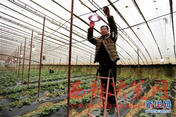 11月20日,河北省衡水市桃城區(qū)鄧莊鎮(zhèn)農(nóng)民在大棚內(nèi)安裝植物生長燈。針對陰天及霧霾天氣造成設施農(nóng)業(yè)大棚采光不好的情況,河北省衡水市桃城區(qū)農(nóng)業(yè)部門通過在全區(qū)推廣植物生長燈、高亮反光膜等方式,保障大棚光線充足,保障蔬菜穩(wěn)產(chǎn)增收。