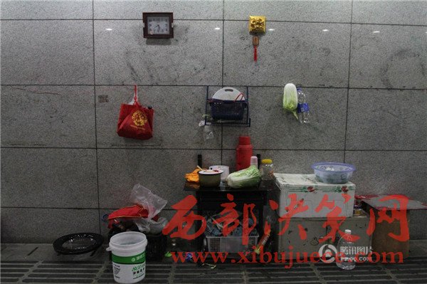 當日,武漢市救助管理站的4名工作人員來過,他們勸流浪漢們?nèi)ゾ戎疚此?,只好給流浪漢們送來了被子和襖子。圖為流浪漢的廚房。