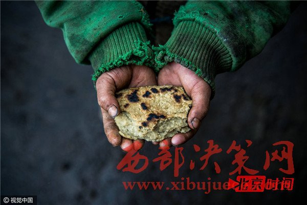 我看到孩子啃這塊玉米面餅的時候,應(yīng)該已經(jīng)放了好幾天了。我用手掰了一下,沒有成功,卻沾了一手的灰土。