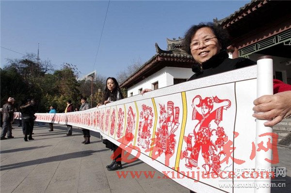 11月30日,在西安市蓮湖公園里,由民間剪紙藝人劉惠霞帶領(lǐng)6名殘疾人學(xué)員、3名志愿者,歷時一年多時間,創(chuàng)作的長22米、寬52厘米的《五十六個民族》巨幅剪紙作品。