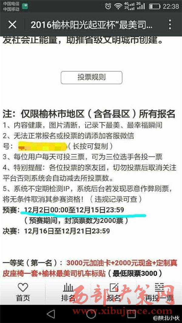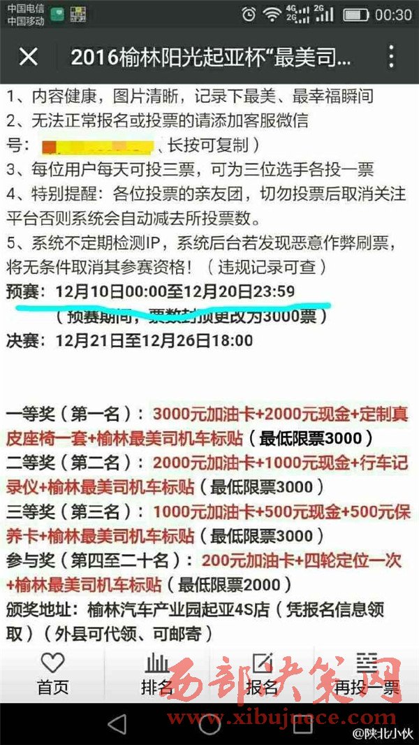 2016年12月初,榆林陽光汽貿(mào)通過某公眾號發(fā)起2016榆林陽光起亞杯“最美司機(jī)”評選活動,活動設(shè)置了豐厚了獎品作為獎勵。并組織全民參與評選活動的投票行為。至此,在榆林眾多市民的朋友圈都發(fā)起了轉(zhuǎn)發(fā)拉票行為。然而,此次拉票行為卻不斷變更投票時間和決賽時間。近日,某公眾號發(fā)布信息,聲稱陽光汽貿(mào)組織的“最美司機(jī)”活動取消,并給予相應(yīng)的票數(shù)補償。此行為卻引起眾多市民的質(zhì)疑,認(rèn)為陽光汽貿(mào)是在“消遣”參與投票的近萬名市民,從而變相成廣告推銷行為。究竟陽光汽貿(mào)是心疼評選活動的獎品發(fā)放,還是一種涉嫌商業(yè)的欺詐行為,請@榆林工商 ,根據(jù)《消費者權(quán)益保護(hù)法》予以重查重處。