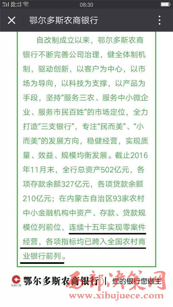 鄂爾多斯農(nóng)商銀行官方微信平臺2016年12月22日發(fā)布文章中稱:鄂爾多斯農(nóng)商銀行自改制成立以來,連續(xù)十五年實現(xiàn)零案件經(jīng)營,各項指標均已跨入全國農(nóng)村商業(yè)銀行前列。