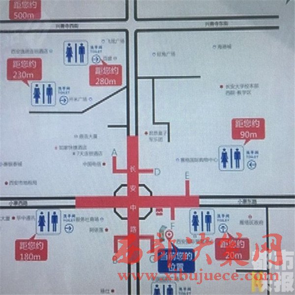在這個指示牌的地圖上,除了標(biāo)注出“所在位置”以及周邊的標(biāo)志性地點,還醒目的標(biāo)出了周圍的衛(wèi)生間地點。圖上標(biāo)明,在小寨十字,周圍一共有七個可用衛(wèi)生間,最遠的一個距離280米,最近的一個距離只有20米。