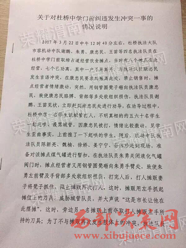 當晚6點以后,涉事執(zhí)法隊員所屬執(zhí)法大隊杜橋執(zhí)法大隊書面回復(fù)便在網(wǎng)絡(luò)中被網(wǎng)友們不斷的轉(zhuǎn)載。據(jù)該回復(fù)稱:2017年3月22日中午12時40分左右,杜橋執(zhí)法大隊市容機動中隊謝鵬、朱勇、康忠民、王苗等4名執(zhí)法隊員在杜橋中學(xué)門前取締占道經(jīng)營飲食攤點,當時有八個攤點在此經(jīng)營,七個已勸離,其中一戶不愿離開,與執(zhí)法隊員康忠民發(fā)生言語沖突,在康忠民要求其搬離此處,禁止銷售時,攤點經(jīng)營者情緒激動,突然,用鋼管圓凳子砸向執(zhí)法隊員康忠民,致使康忠民胳膊、背部等多處軟組織損傷,執(zhí)法隊員謝鵬、王苗等見狀,立即趕到康忠民處進行勸導(dǎo),在勸導(dǎo)過程中,杜橋中學(xué)一名學(xué)生說城管打人,不明真相的約五六十名學(xué)生一起起哄、謾罵城管,因康忠民被打,情緒比較激動,見學(xué)生歪曲事實,上前推了一下起哄的學(xué)生,隨后,機動中隊執(zhí)法隊員朱勇、陳新亮、魏楠、徐嬌、姜寧寧、孫偉珍趕到現(xiàn)場,準備對該攤點煤氣罐進行暫扣,在執(zhí)法隊員朱勇關(guān)閉液化氣罐閥門時,攤點經(jīng)營者用鋼管圓凳砸向朱勇手臂處,致使朱勇左前臂及手背部多處軟組織損傷,打完人后,打人攤販妻子將凳子抓住,阻止攤販再次打人,這時,攤販用左手抓起攤位上的刀具,威脅城管隊員,并大聲說“這是市長讓他在此擺攤”,這時,旁邊另一名攤販上前奪取打人攤販左手所持的刀具;為了不與攤販再次發(fā)生肢體上的沖突,執(zhí)法隊員王苗撥打110報警,在警察到現(xiàn)場之前,攤販與執(zhí)法隊員一直僵持;警察趕到現(xiàn)場后,與商販進行交涉,這時,商販亮出了精神病證,警察看后,把執(zhí)法隊員叫到一旁,告知執(zhí)法隊員此人有精神??;鑒于這種情況,執(zhí)法隊員依據(jù)法律法規(guī),將該攤點煤氣罐進行暫扣,并將暫扣單交于打人商販的妻子,隨后,警察要求執(zhí)法隊員撤離現(xiàn)場,對當事人進行教育。