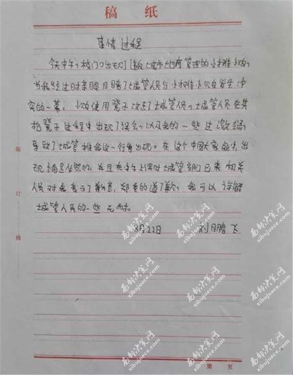 同時,該回復(fù)還出現(xiàn)了學(xué)生和兩名執(zhí)法人員面對面的照片,在回復(fù)的最后有該學(xué)生手寫的事情過程。據(jù)該學(xué)生手寫過程稱,當時學(xué)生親眼目睹了城管與小販發(fā)生沖突的一幕,既然是親眼目睹,為何會有視頻中的“隨便打人”一說嗎?可想而知孩子在寫這份事情過程的時候是什么樣的心情。