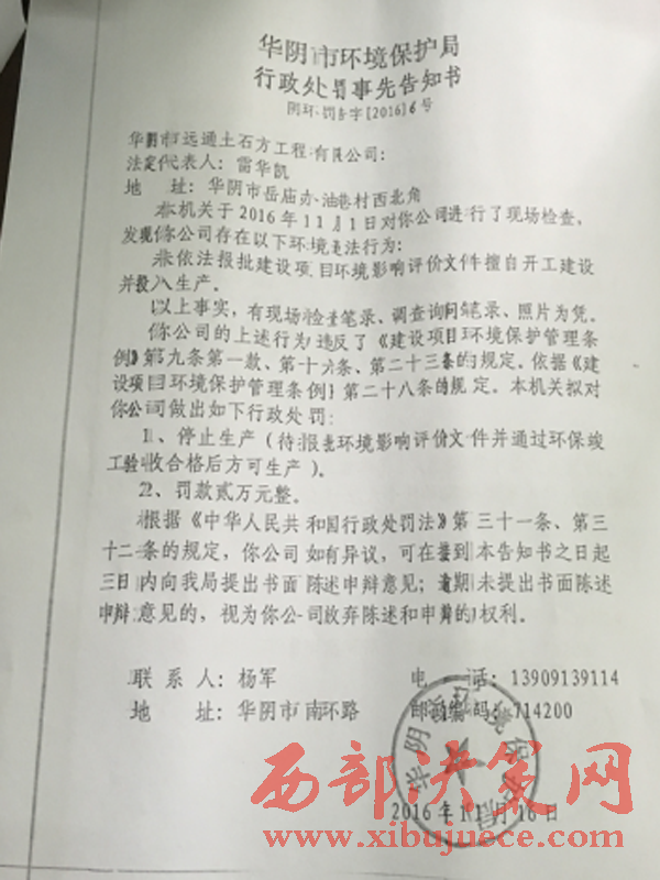 一份2016年11月23日《華陰市環(huán)境保護局行政處罰決定書》復印件顯示,環(huán)保局于2016年11月1日對該公司進行了現(xiàn)場檢查,發(fā)現(xiàn)該公司存在未依法報批建設項目環(huán)境影響評價文件擅自開工建設并投入生產(chǎn)。處罰是停止生產(chǎn)和罰款2萬元。