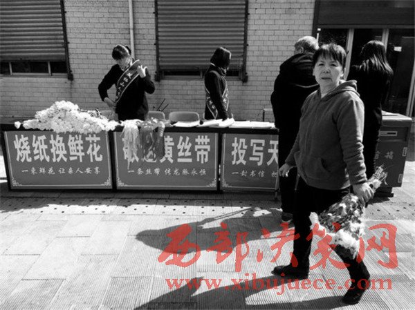 昨天記者走進(jìn)鳳棲山人文紀(jì)念園,大門(mén)口處擺放的桌子非常顯眼。紀(jì)念園的工作人員在桌上放置了大捧的鮮花和黃絲帶,并打出溫馨提示,“燒紙換鮮花,讓親人安享”的標(biāo)語(yǔ),倡導(dǎo)市民文明祭祀,營(yíng)造良好的祭祀環(huán)境。